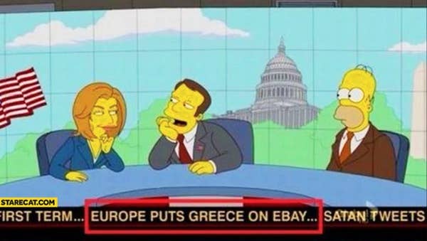 You are here: Home People Les Simpsons : 21 prédictions devenues réalité in Actualité, Entertainment, People, WOW, WTF Les Simpsons : 21 prédictions devenues réalité 2.1k Views -1 Votes 20.Lorsque la Grèce a connu un ralentissement économique : Cet épisode a été diffusé en 2013. La Grèce a fait défaut sur sa dette en 2015. Fox Page 20 sur 21Précédent 123456789101112131415161718192021SuivantCoronavirusDisneyDonald TrumpEbolaFoxGame of ThronesKobe Bryantl'avenirLady GagaSimpsons See more Previous article 15 pères qui passent une pire journée que vous Next article 23 photos prises juste avant la catastrophe